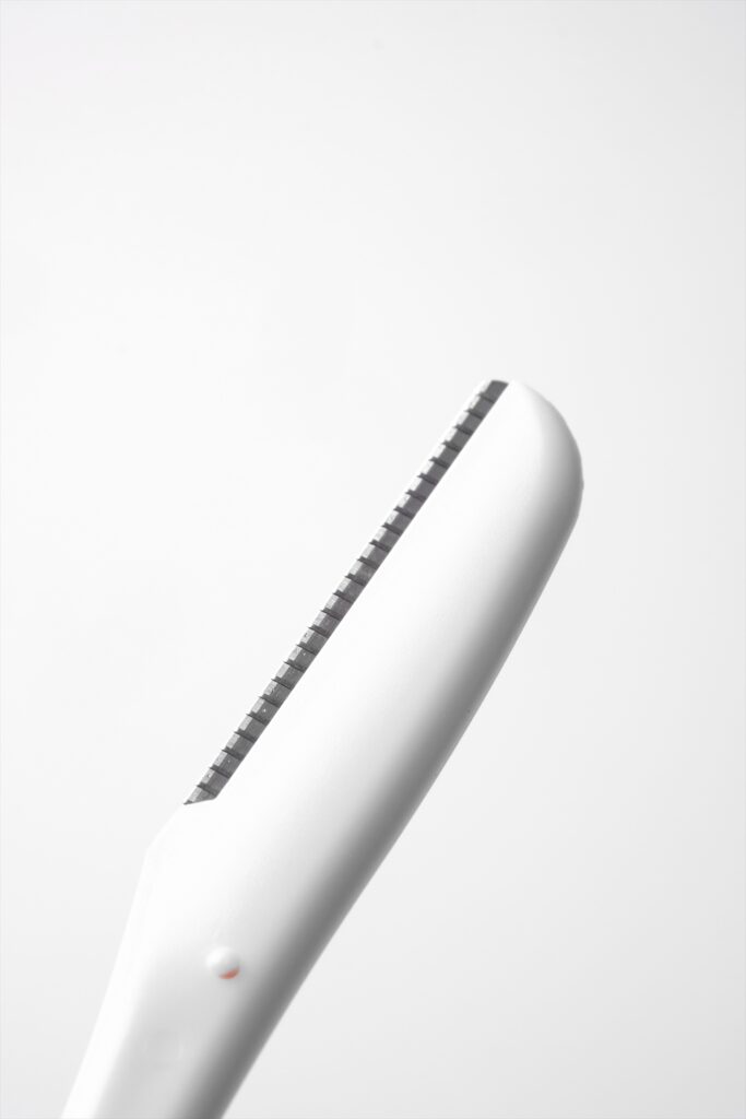 ペンを握るように、かみそりを持ちます。刃は45度くらいに寝かせ、剃りたい部位の毛の流れに沿って、優しく剃ります。顔の曲面や凹凸部分は肌を引っ張って、できるだけ平面にするとうまく処理ができます。